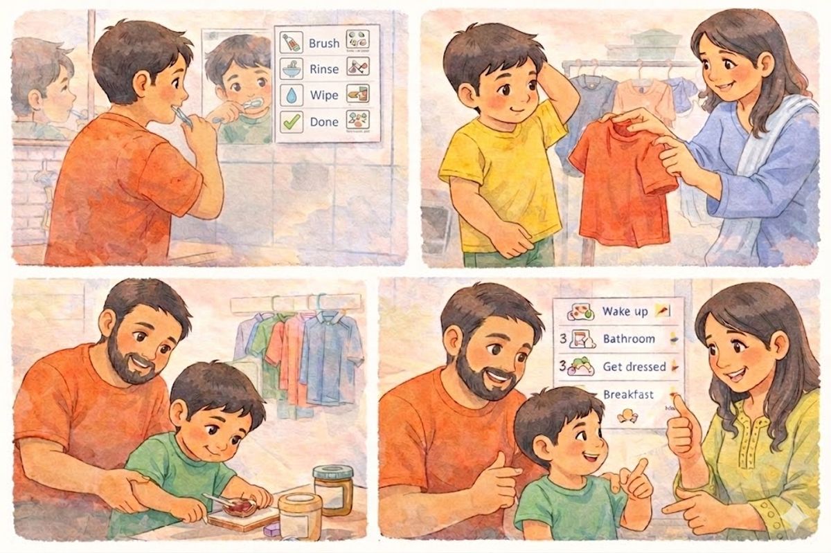 Practice routines during calm, non-rushed times before expecting independence during busy mornings